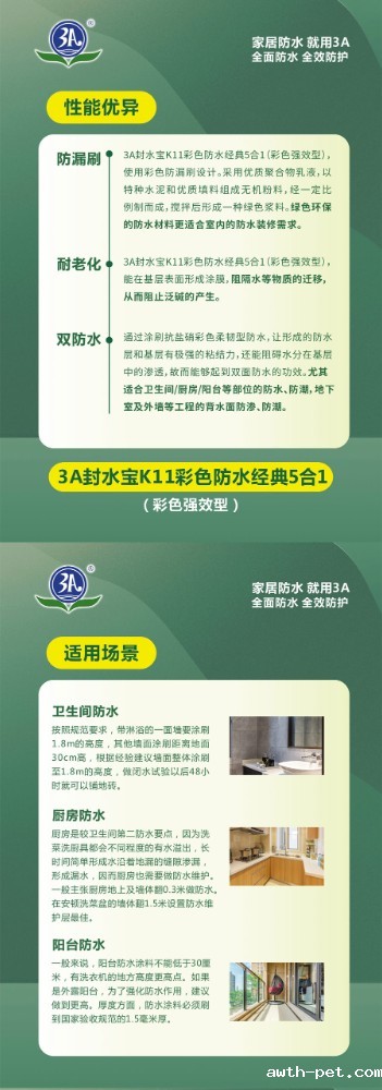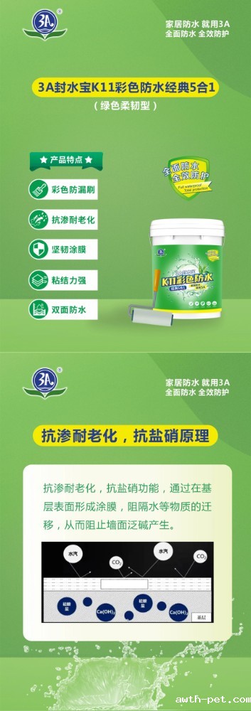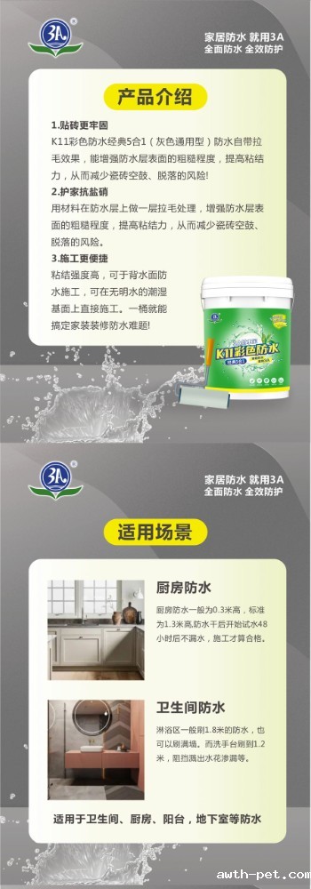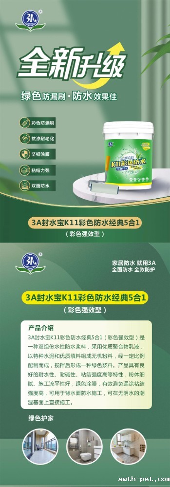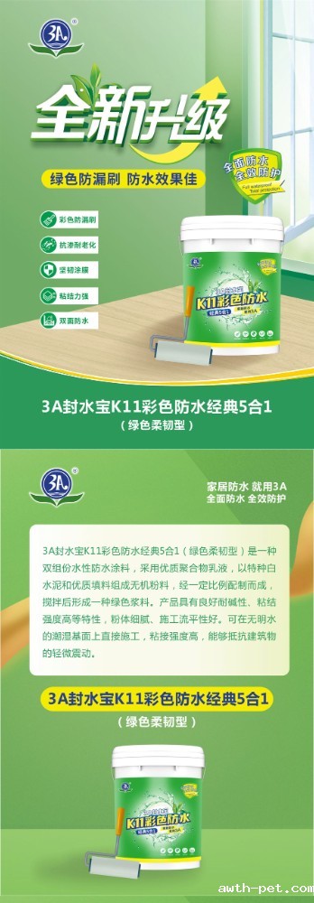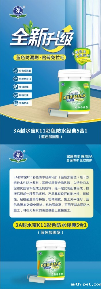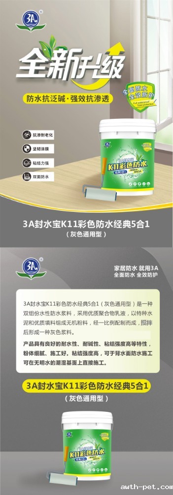 3A封水宝K11彩色防水经典5合1是一种双组份水性防水浆料,采用优质聚合物乳液,以特种水泥和优质填料组成无机粉料,经一定比例配制而成,搅拌后形成浆料。产品具有良好的耐水性、耐碱性、粘结强度高等特性,粉体细腻、施工流平性好,有效避免漏涂。粘结强度高,可用于背水面防水施工,可在无明水的潮湿基面上直接施工。